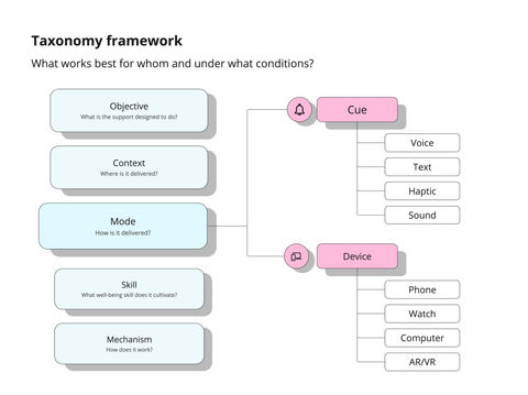 Responding to our users’ needs for “bite-sized” practices that delivered real-time support, we began researching what type of interventions would work best for whom and under what conditions. In addition to conducting market research, we ideated device-specific options, developed user personas, and built a taxonomy framework of contexts and needs.